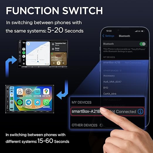🚀 [اتصال آسان و سوئیچینگ یکپارچه] SMT-AC01 با تراشه و ماژول وایفای پیشرفته خود، یک تجربه واقعاً بیسیم را بدون دردسر کابلها ارائه میدهد. به سرعت و به راحتی تنها در سه مرحله ساده متصل شوید: وصل، جفتسازی و اجرا. به سادگی بلوتوث محصول را دوباره جفت کنید و بسته به گوشی جفت شده (اندروید یا iOS) به راحتی بین اندروید اتو بیسیم / کارپلی بیسیم جابجا میشود، تعویض دو در یک هرگز تا این حد روان نبوده است!