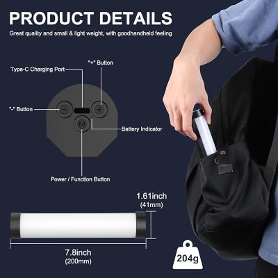 چراغ قوه قابل حمل LED: چراغ ویدیویی RGB LED از PC سخت و یک ماسک نور نرم با اتلاف حرارت عالی ساخته شده است. تنها 204 گرم / 0.45 پوند وزن، 20 سانتی متر / 7.87 اینچ طول و 4.1 سانتی متر / 1.61 اینچ عرض. قابل استفاده برای پرتره، ویدئو بلاگ، نورپردازی محیطی، رنگ نور و عکاسی و غیره.
