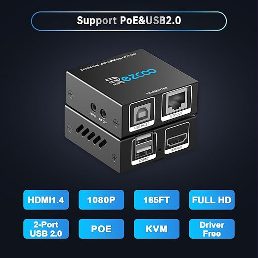 کی وی ام اکستندر HDMI از نوع USB به RJ45 با پشتیبانی از کابلهای Cat5e/6/7 و رزولوشن 1080P و فرکانس 60 هرتز تا مسافت 150 فوت/50 متر، فرستنده و گیرنده HDMI از طریق اترنت، کیبورد و ماوس، 2 پورت USB2.0، هاب، POE، استریو، صدا و میکروفون
