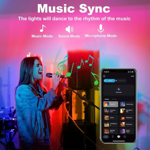 منبع نور: ویژگیهای خاص: تغییر رنگ RGB، کنترل برنامه و صدا، سناریو، میکروفون، حالتهای موسیقی