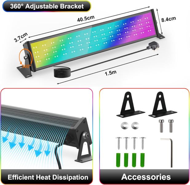 【چراغ دیواری LED هوشمند RGB ضد آب IP66】نورافکن 72 وات با روشنایی تا 7000 لومن و دمای رنگ قابل انتخاب (2700K-6500K). این چراغ پروژکتوری رنگی LED برای روشنایی داخل خانه، پاسیو، باغ، تراس، راهرو، کریدور، بالکن و مهمانی و غیره مناسب است.