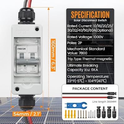 جعبه قطع کننده خورشیدی: مناسب برای سیستم متصل به شبکه پنل خورشیدی فتوولتائیک و سیستم تولید برق خورشیدی مستقل از شبکه، خانه، RV و غیره. با درجه ضد آب IP65، میتوان از آن برای محافظت در برابر باران در فضای باز استفاده کرد. خدمات پس از فروش: در صورت وجود هرگونه مشکل در محصول دریافتی، لطفاً به پلتفرم یا مرکز پشتیبانی مشتری ما مراجعه کنید، ما خدمات عالی را به شما ارائه خواهیم داد. میتوانید با اطمینان خاطر کلید قطع اتصال پنل خورشیدی ما را برای نیازهای حفاظت الکتریکی خود انتخاب کنید. این بسته شامل ۱ عدد کلید قطع اتصال، ۲ عدد پیچ، ۴ عدد ترمینال، ۲ عدد رابط خورشیدی، ۱ عدد آچار فرانسه و ۱ عدد دفترچه راهنما است.