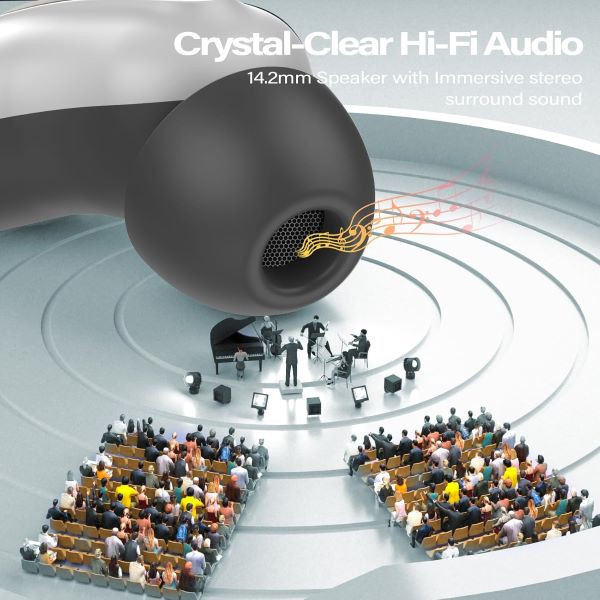 حذف نویز موثر: هدفونهای بیسیم داخل گوشی بیسیم D20 حذف نویز مضاعف را ارائه میدهند. حذف نویز فعال (ANC) نویز محیط مانند خروپف، سر و صدای خیابان یا تهویه مطبوع را سرکوب میکند. در عین حال، ۴ میکروفون ENC به طور قابل اعتمادی تداخل را در طول تماسها فیلتر میکنند. ایدهآل برای گوش دادن متمرکز یا تماسهای تلفنی حتی در محیطهای پر سر و صدا. صدای عالی Hi-Fi: هدفونهای بلوتوثی با بلندگوی بزرگ ۱۴.۲ میلیمتری، طیف صوتی چشمگیری را تجربه کنید. بیس قدرتمند، صداهای زیر شفاف و صداهای میانی متعادل. چه پادکست، چه موسیقی ملایم یا تماس تلفنی - با هدفونهای D20، هر منبع صوتی به یک لذت تبدیل میشود.
