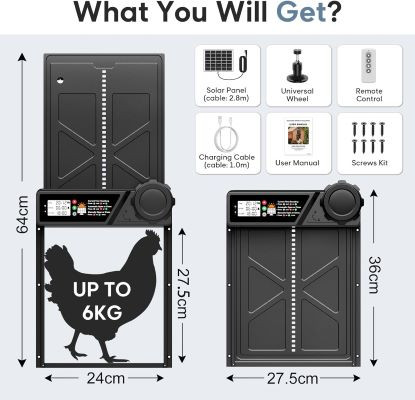 درب اتوماتیک مرغداری بزرگ با پنل خورشیدی – درب بازکن اتوماتیک مرغداری با موتور، حالتهای تایمر برای نگهداری ایمن و راحت مرغ با سنسورهای هوشمند مانع، کنترل از راه دور، ارتفاع 14.2 اینچ و طول 10.83 اینچ