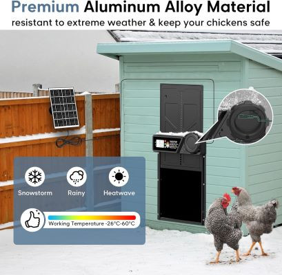 🏅 [ساخت آلیاژ آلومینیوم بادوام] این درب اتوماتیک مرغداری که از آلیاژ آلومینیوم با کیفیت بالا و مواد ABS ساخته شده است، ضد آب و بادوام است و در برابر دما از -۲۶ درجه سانتیگراد تا ۶۰ درجه سانتیگراد مقاومت میکند. مرغهای خود را در هر شرایط آب و هوایی ایمن نگه دارید