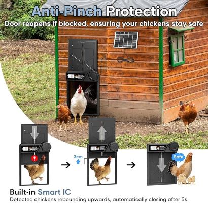 ⏰ [اتوماسیون آسان با تنظیمات تایمر] زمانهای باز و بسته شدن دلخواه خود را با تایمر داخلی تنظیم کنید و به درب اجازه دهید طبق برنامه شما به طور خودکار کار کند. از مدیریت بدون نگرانی و آزادی سفر بدون نگرانی در مورد ایمنی مرغ خود لذت ببرید. 📺 [صفحه نمایش LCD شفاف] درب اتوماتیک مرغداری مجهز به یک صفحه نمایش LCD روشن، تنظیم زمانهای دلخواه شما را با وضوح دید روی صفحه نمایش، بسیار آسان میکند. بدون برنامهریزی پیچیده – فقط یک راهاندازی سریع و آسان.