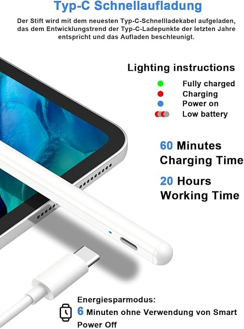 شارژ USB Type-C و عملکرد خاموش شدن هوشمند: این قلم استایلوس فعال از طریق پورت شارژ USB Type-C محبوب سالهای اخیر شارژ میشود، بنابراین میتوانید به راحتی آن را برای شارژ به رایانه یا آداپتور خود متصل کنید. در همین حال، اگر فراموش کنید تلفن خود را خاموش کنید، قلم به طور خودکار پس از 6 دقیقه عدم فعالیت خاموش میشود و به طور موثر از هدر رفتن انرژی ناشی از فراموش کردن خاموش کردن تلفن جلوگیری میکند و در نتیجه از باتری شما محافظت میکند.
