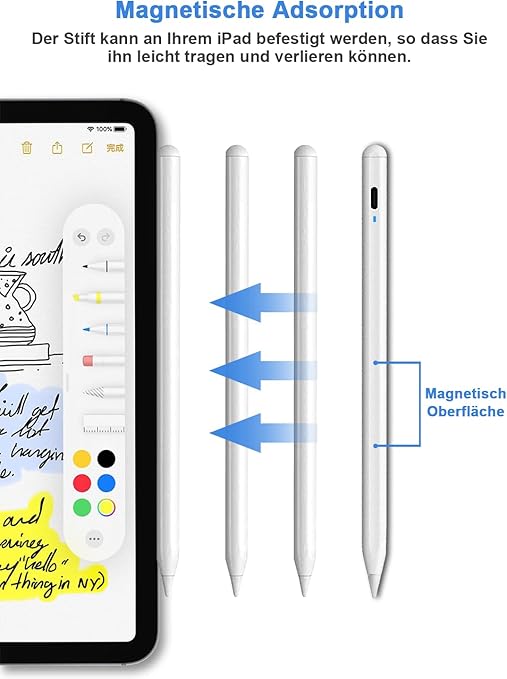 عملکرد جذب مغناطیسی: این قلم تبلت دارای عملکرد جذب مغناطیسی است. قلم را میتوان به کنار تبلت متصل کرد که حمل آن را آسان کرده و از گم شدن آن جلوگیری میکند. این قلم برای کارمندان اداری در سفرهای کاری بسیار مفید است. توجه: عملکرد جذب مغناطیسی از موارد زیر پشتیبانی میکند: آیپد پرو ۱۲.۹ اینچی (نسل سوم/چهارم/پنجم)؛ آیپد پرو ۱۱ اینچی؛ آیپد ایر ۴؛ آیپد مینی ۶.
